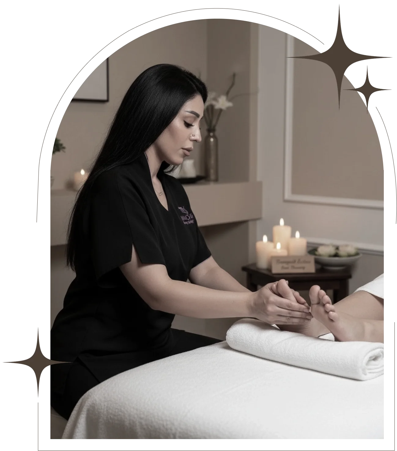 Our Tranquil Lotus Foot Therapy is designed to provide a luxurious and revitalizing experience for your feet and lower legs. Using soothing massage techniques, reflexology, and nourishing oils, this therapy relieves tension, improves circulation, and leaves your feet feeling soft, refreshed, and fully rejuvenated.